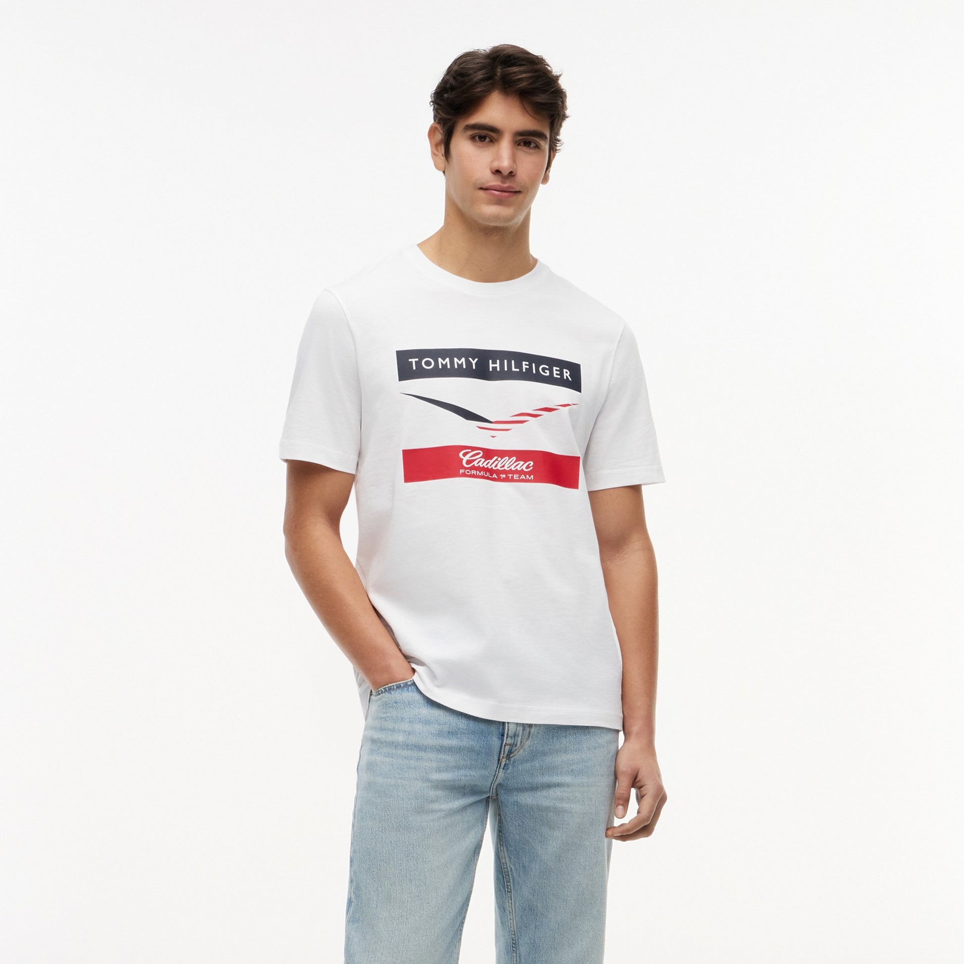 Show your support for the Cadillac Formula 1 Team with the Cadillac F1 x Tommy Hilfiger Chevron T-Shirt for Men in classic white. This premium men’s tee blends American motorsport heritage with iconic Tommy Hilfiger style.