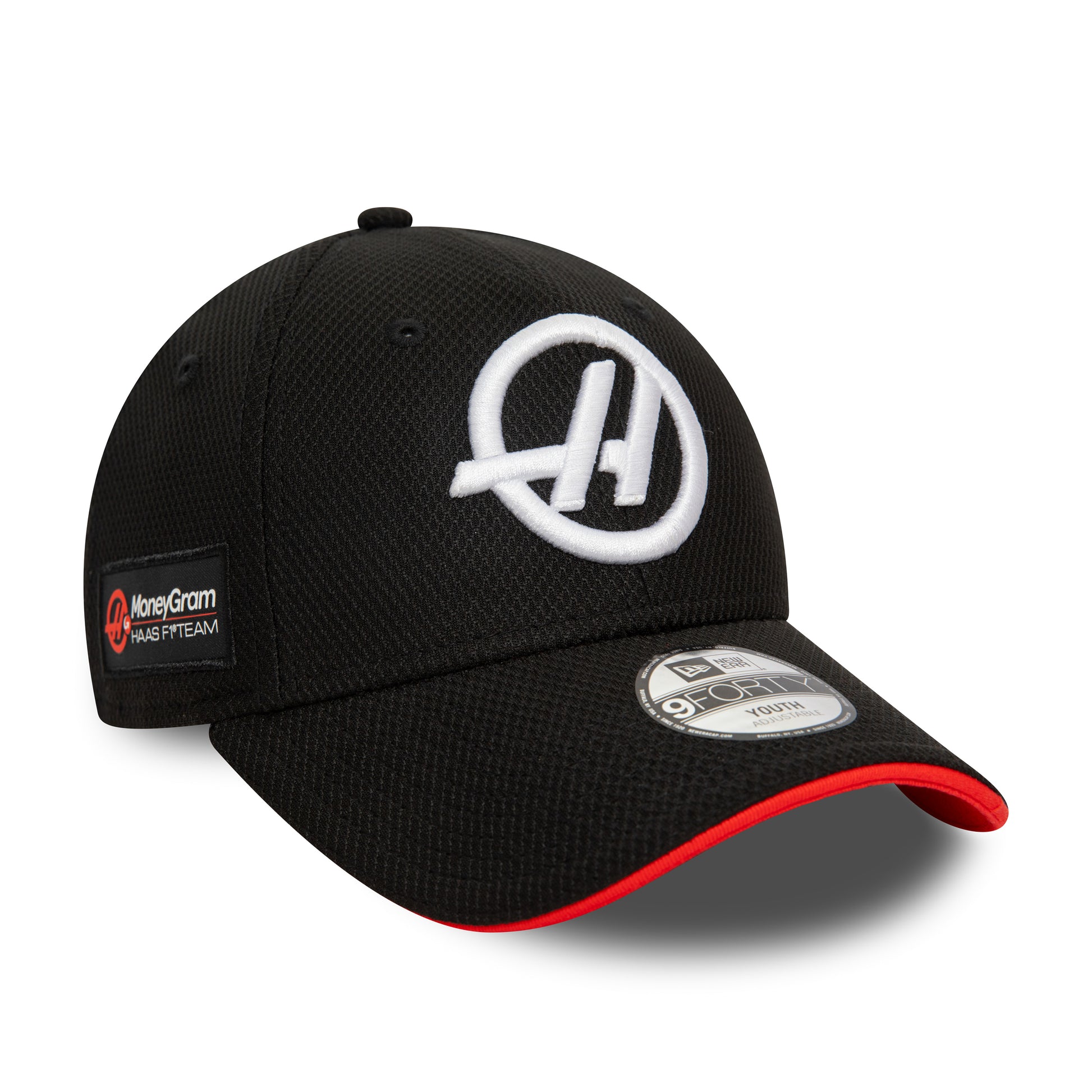 Haas F1 Team cap for the kids, as worn by the Haas Formula One Team during the 2024 F1 World Championship. Made by and featuring the New Era flag.