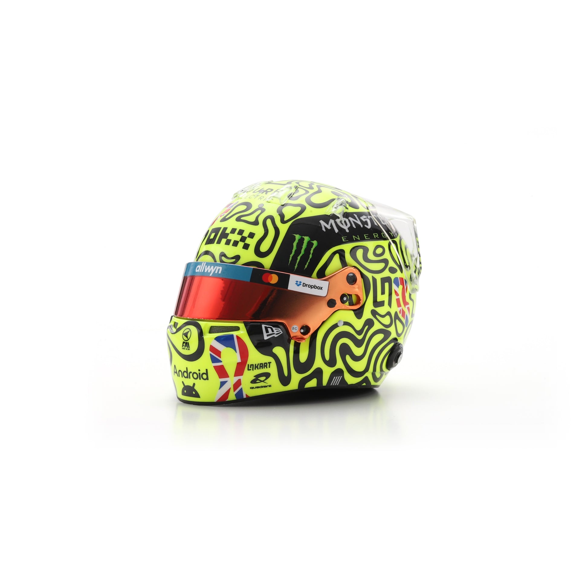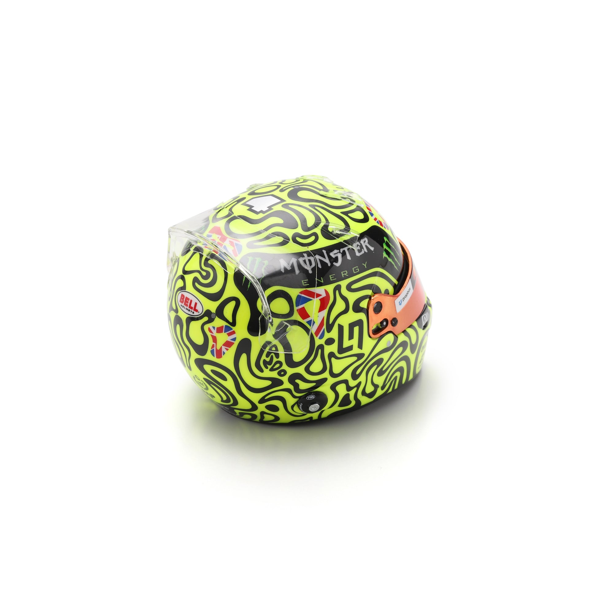 Produced by Spark, this officially licensed mini helmet is finished to a high standard, featuring the distinctive high-visibility colour scheme, accurate sponsor logos, and a tinted visor. Every detail reflects the race-spec helmet worn during the British Grand Prix, making it a meaningful collector’s piece for McLaren fans and Formula 1 enthusiasts alike.